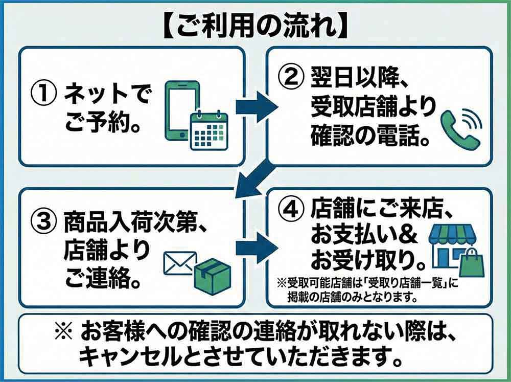 ※受取可能店舗は「受取り店舗一覧」に掲載の店舗のみとなり、一覧にない店舗でのお受け取りはできません。 あらかじめご了承ください。